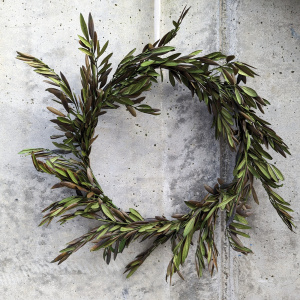 Minimalistický zelený věnec pouze z listů a větviček, např. olivovníku.