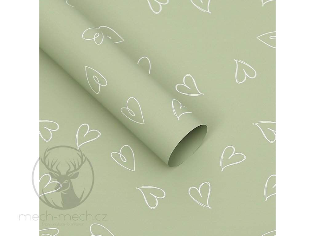 Floristická fólie s potiskem bílých srdcí na elegantním šalvějově zeleném podkladu je vyrobena z odolného materiálu BOPP, který je rezistentní proti vlhkosti a roztržení. Jemná barevnost se dokonale hodí k pastelovým a přírodním kyticím, zatímco motiv srdcí dodává aranžmá romantický nádech.
