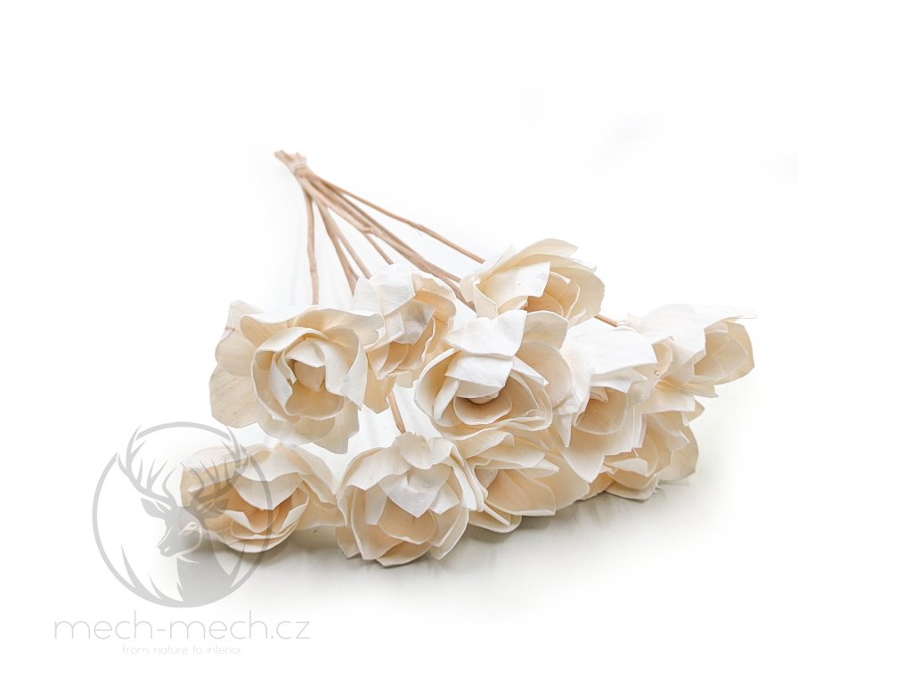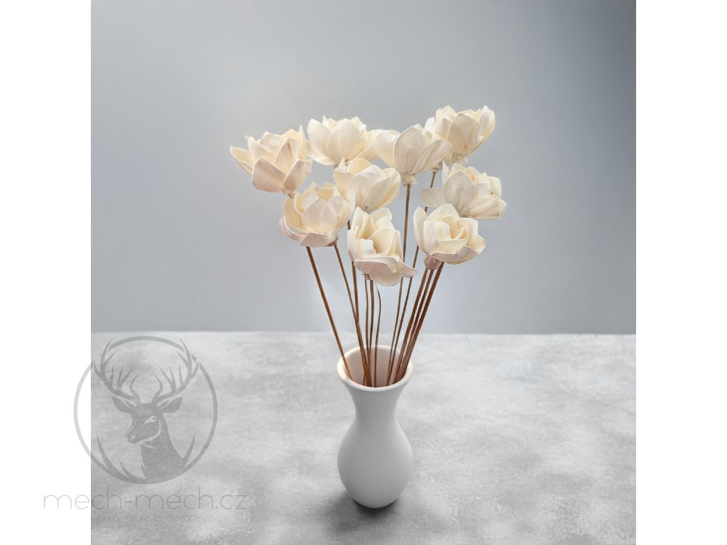 Shola Bellatrix je elegantní a lehká ozdoba, ručně vyrobená z přírodního rostlinného materiálu; každý květ má průměr přibližně 6 cm a je umístěn na dřevěném stonku o délce 45 cm. Model Bellatrix se vyznačuje lehce spirálovitým uspořádáním okvětních lístků, připomínajícím kombinaci gardénie a růže; jeho jemný tvar a přírodní barva z něj činí vynikající doplněk ke kompozicím ve stylu boho, japandi a rustikálním. Každý květ Shola Bellatrix je vytvářen individuálně, proto se může lišit uspořádáním okvětních lístků, strukturou nebo odstínem; jedinečnost, drobné pomačkání či nerovnosti jsou přirozenou vlastností ruční práce a potvrzují její autenticitu, přičemž okvětní lístky lze v případě potřeby opatrně narovnat a navrátit jim tak původní tvar. Květiny Shola Bellatrix vznikají z přírodního, lehkého rostlinného materiálu, který na dotek připomíná tenký korek nebo rýžový papír; jsou biologicky rozložitelné a trvanlivé, díky čemuž představují skvělou alternativu k umělým květinám, a jejich subtilní vzhled zajišťuje, že se skvěle hodí k travám, mechu, eukalyptu a dalším sušeným rostlinám. Květiny Shola Bellatrix jsou ideální pro svatební kytice a kompozice, boho a japandi aranžmá, DIY projekty a sezónní dekorace, a také jako ozdoby stolů, věnce a výzdoby interiérů.