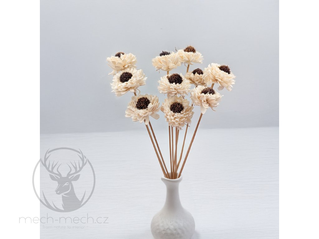 Shola Zinia Daisy je ručně tvarovaná dekorace, inspirovaná tvarem cínie a sedmikrásky; každý květ má průměr přibližně 6 cm a je umístěn na dřevěném stonku o délce 45 cm. Díky subtilní struktuře okvětních lístků připomíná čerstvou, luční květinu – plnou přírodního půvabu a jednoduchosti. Květiny Shola Zinia Daisy jsou vytvářeny z lehkého, přírodního materiálu rostlinného původu; každý exemplář je unikátní – může se lišit uspořádáním okvětních lístků, tvarem nebo odstínem. Drobné pomačkání či nepravidelnosti jsou přirozenou vlastností ruční práce, která podtrhuje autenticitu produktu, přičemž okvětní lístky lze opatrně narovnat nebo ručně dotvarovat. Model Shola Zinia Daisy spojuje lehkost sedmikrásky a formu cínie, čímž vytváří kompozici plnou svěžesti a půvabu; ideálně se hodí do aranžmá ve stylu boho, rustikálním, japandi a přírodním, a skvěle se uplatní v kyticích, věncích a dekoracích interiérů. Květiny Shola Zinia Daisy jsou vhodné pro svatební kytice a kompozice, boho a japandi aranžmá, DIY projekty a sezónní dekorace, a slouží také jako ozdoby stolů, váz a svícnů.