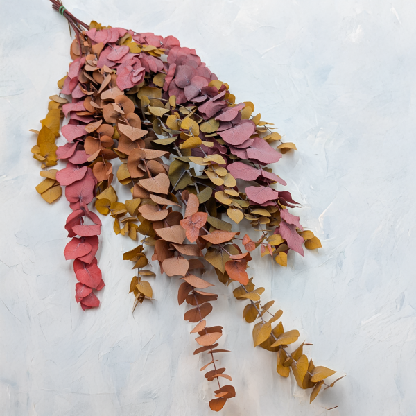 Fotografie znázorňují rozmanité druhy stabilizovaného eukalyptu v barvách, které dokonale odrážejí podzimní paletu. Od teplých, oranžových a žlutých tónů, po syté červené, burgundské a tmavé bordó – tyto rostliny představují ideální dekoraci pro podzimní dny. Podívejme se na některé druhy eukalyptu, které lze využít v domácích aranžmá. Tento druh se vyznačuje jemnými, úzkými lístky v odstínech červené. Jeho elegantní forma se skvěle hodí do věnců a menších kytic.