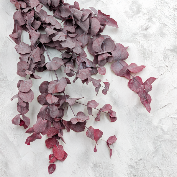 Eukalyptus Nicoly tmavě vínový: Intenzivní bordó odstín Nicoly se skvěle uplatní v tlumenějších, elegantních aranžmá. Perfektní pro minimalistické dekorace.