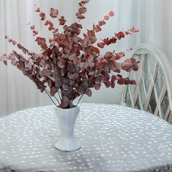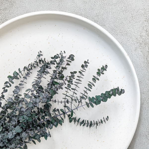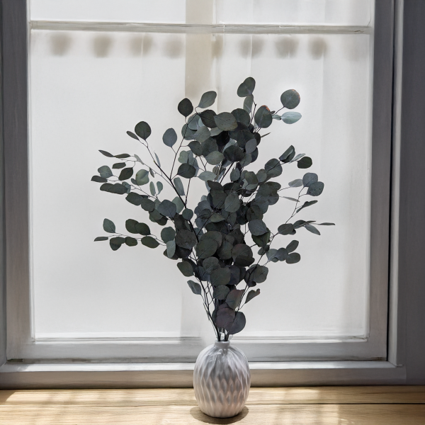 Drobné lístky hustě posazené kolem větvičky vytvářejí kompaktní a precizní strukturu eukalyptu Baby Blue. Tato odrůda je často vybírána pro detailní floristické práce – věnečky do vlasů, korsáže nebo drobné svatební dekorace. Umožňuje snadnou kontrolu nad proporcemi a formou.