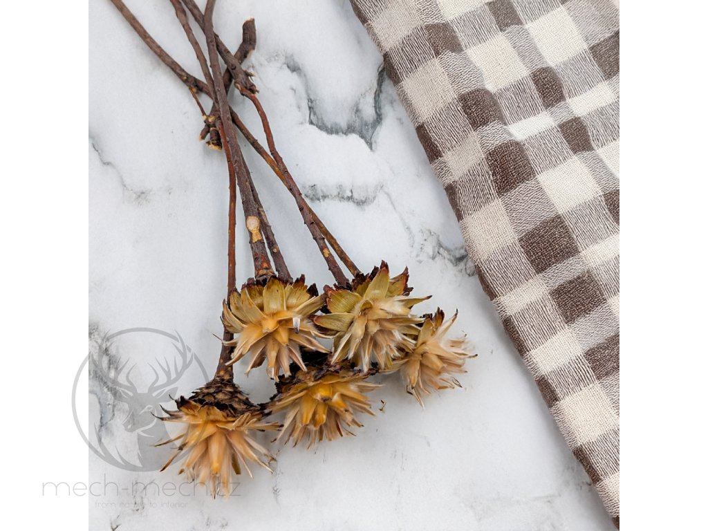 Sušené květiny si zachovávají svou původní krásu bez nutnosti zvláštní péče. Jsou proto vynikající volbu pro milovníky působivých dekorativních prvků. Sušené květiny lze použít k dekoraci interiérů mnoha různými způsoby. Jedná se o přírodní produkt, proto nebudou dvě větvičky/rostliny identické tvarem ani strukturou. Pamatujte, že sušené rostliny jsou křehké a neměly by být vystaveny povětrnostním podmínkám a přímému slunečnímu záření, nepotřebují zalévat, chraňte je také před dlouhodobým teplem, chladem a nadměrnou vlhkostí, protože tyto faktory mohou ovlivnit jejich trvanlivost a vzhled. Barvy se mohou mezi šaržemi lišit. Zlomené nebo popraskané stonky nebo listy jsou pro tento typ produktů přirozený. Obarvené rostliny časem ztrácejí barvu a při dlouhodobém vystavení příliš vysoké vlhkosti mohou pouštět barvu.