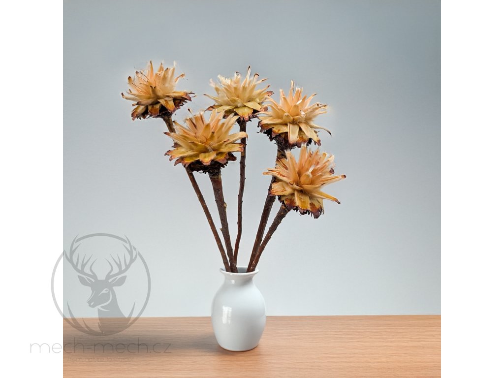 Sušené Plumosum (Leucospermum plumosum) je jedinečná exotická rostlina s dekorativními šišticovými květenstvími. Jejich přirozený krémový odstín dodává kompozicím jemnost a eleganci, zatímco jejich unikátní textura vnáší do aranží exotický nádech. Díky své odolnosti a tvaru se Plumosum skvěle hodí jako výrazný floristický prvek. Můžete jej použít jako samostatnou dekoraci ve váze, která vytvoří silný akcent v interiéru, nebo jako doplněk do svatebních a příležitostných kytic. Je také ideální pro sezónní kompozice, věnce a jiné dekorace, a to zejména v boho, rustikálním a moderním stylu. Je oblíbené pro svůj neopakovatelný exotický vzhled, přirozenou barvu, která se hodí k mnoha aranžím, a především pro svou trvanlivost, díky které si zachová svůj půvab po velmi dlouhou dobu.