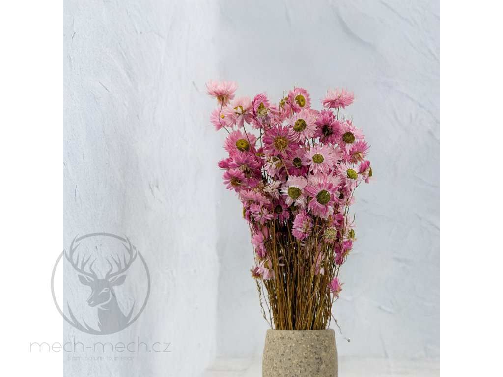 Sušená Imortelka (Acroclinium) není jen obyčejná květina, ale spíše posel harmonie a krásy přírody, který oživí každý interiér i květinovou kompozici. Jemné růžové květy prošly šetrným sušením, aby si zachovaly svou svěžest, krásu a půvab po mnoho let. Sušená Imortelka je pečlivě vybírána z těch nejkvalitnějších rostlin, takže si můžete být jisti, že vám přinese radost a spokojenost. Subtilní růžová Imortelky je univerzální dekorací, která se hodí pro každou příležitost. Můžete ji použít k tvorbě originálních kytic, věnců a květinových aranžmá, která dodají vašemu domovu útulnou atmosféru a nadčasový šmrnc. Sušená Imortelka je také ideálním dárkem pro milovníky květin a krásných dekorací, kteří si cení tradice a elegance. Nechte se okouzlit Sušenou Imortelkou a vneste do svého života kousek přírodní krásy a vytvořte si originální květinové dekorace pro váš domov.