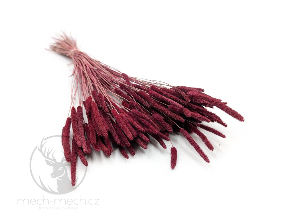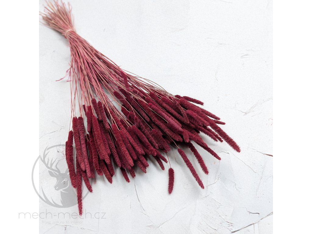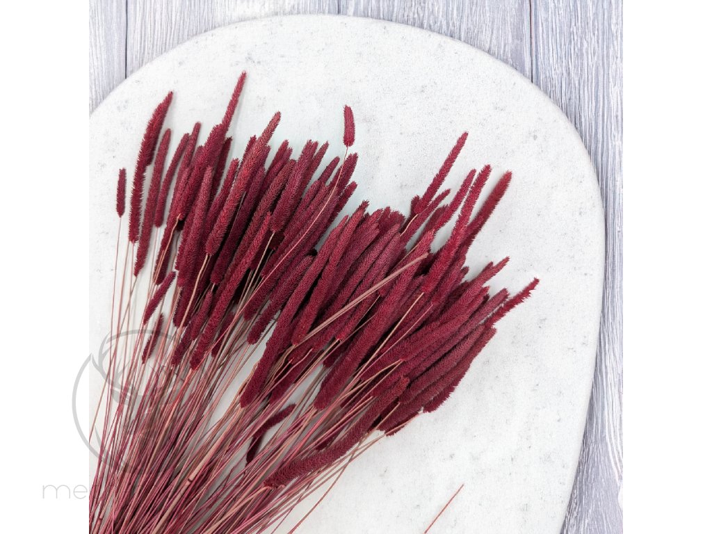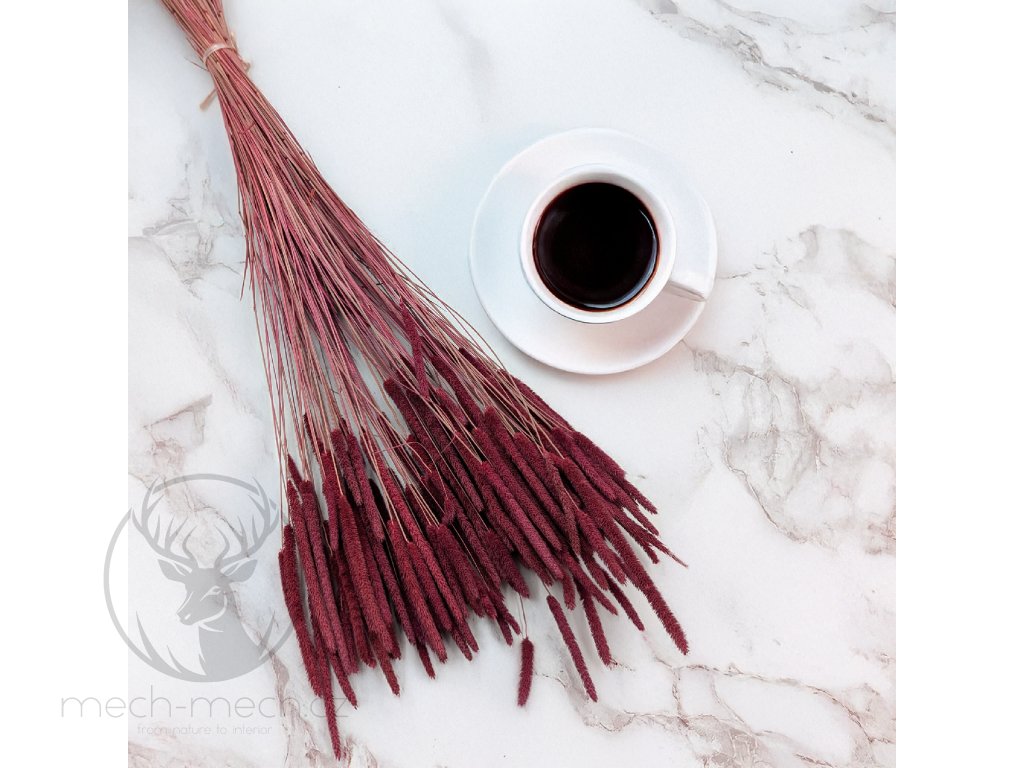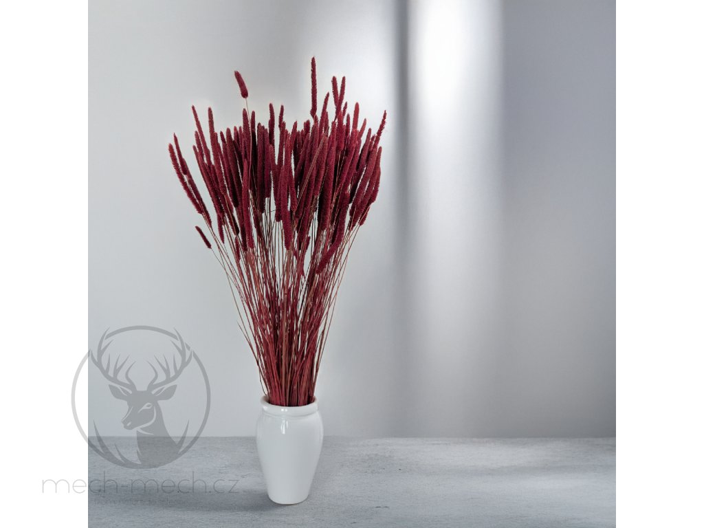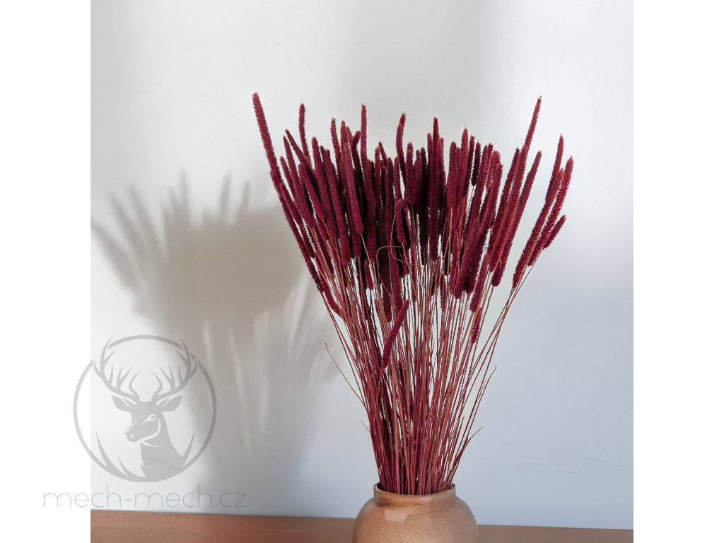 Sušený Bojínek v bordó odstínu přináší do interiéru sytost, eleganci a výraznou hloubku. Tato tmavě červená barva symbolizuje vášeň, noblesu a stabilitu – ideálně se hodí do romantických, klasických i moderních aranžmá, kde má vytvořit dominantní, ale vkusný akcent. Jeho bohatý odstín skvěle kontrastuje s jemnějšími tóny květin nebo přírodními materiály a snadno upoutá pozornost bez zbytečného přehánění. Díky své hrubší struktuře a výraznému tvaru klasů dodává každé kompozici hloubku, charakter a luxusní nádech. Na první pohled může působit jako nenápadný prvek, ale v okamžiku se stává vizuální dominantou celé dekorace – ať už v minimalistické váze, svátečním věnci nebo nástěnném aranžmá. Tento druh sušené trávy je zároveň mimořádně praktický – nevyžaduje žádnou péči, zachovává si svůj tvar i barvu a zůstává krásný po mnoho měsíců. Bordó Bojínek je rovněž ekologickou volbou – nevadne, nezatěžuje životní prostředí a působí přirozeně i udržitelně. Je ideální pro ty, kteří hledají trvalou a stylovou alternativu k čerstvým květinám, bez nutnosti pravidelné péče.